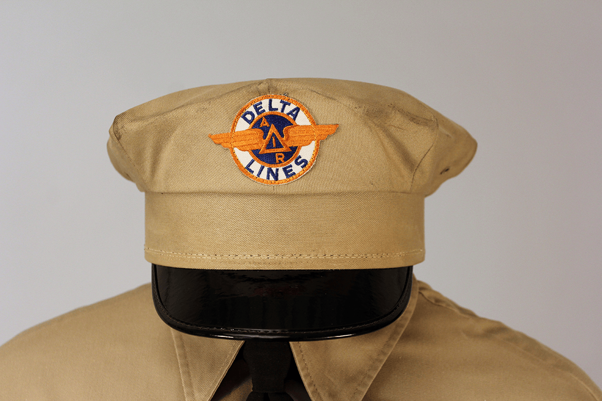 Line maintenance, and other aircraft maintenance technicians continually in public view wear khaki shirt and pants. Orange/blue Delta patch is on a black-brimmed khaki hat and over left pocket of shirt and coveralls. Black tie available. Khaki uniforms worn until 1973, with updates to insignia patches through the years.