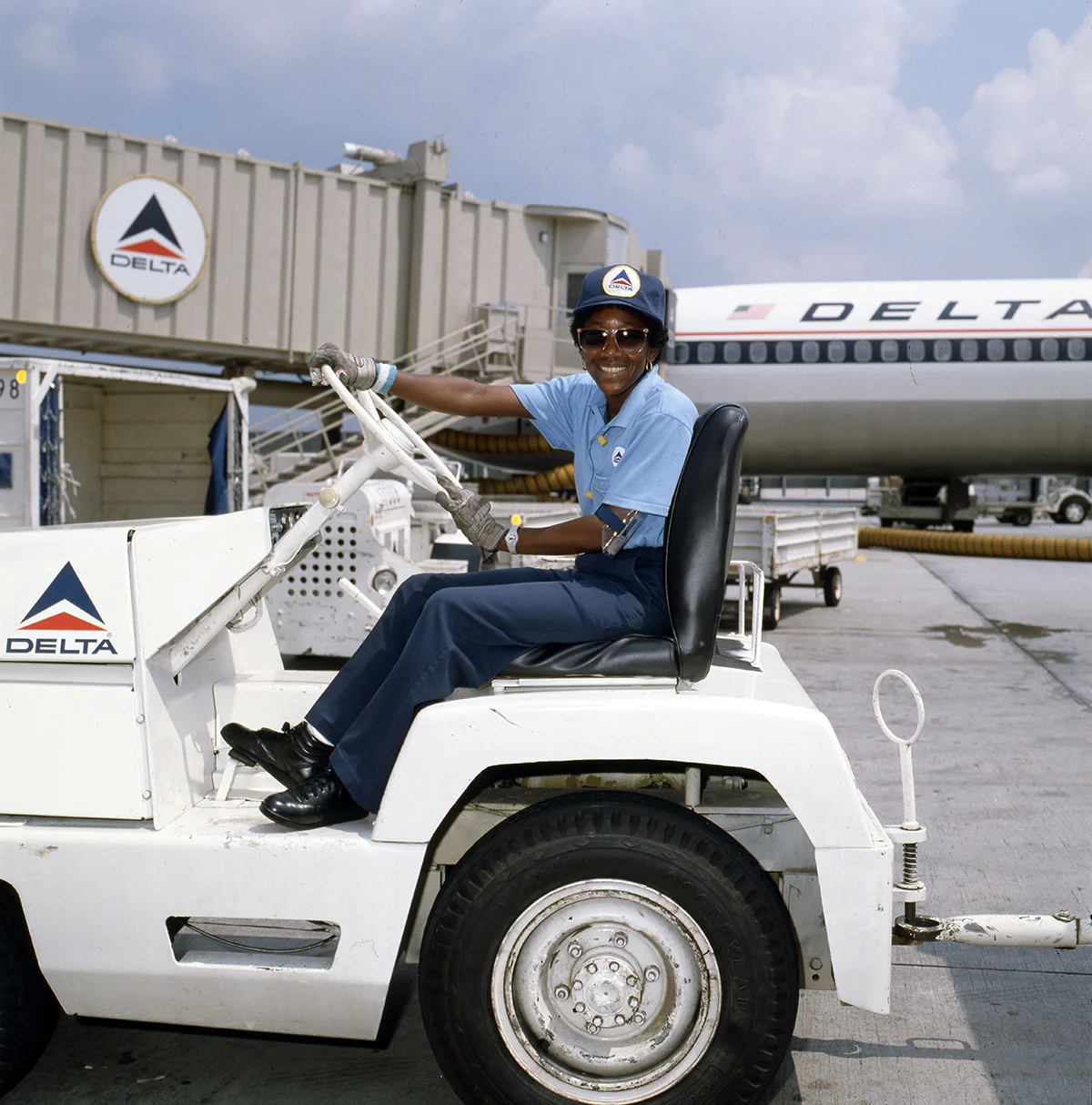 Ramp and cargo service agents continue to wear slate gray uniform pieces until 1973. Delta-issues cold weather gear: a short gray jacket and a bulky navy blue coat with detachable hood, nicknamed “Big Blue.”