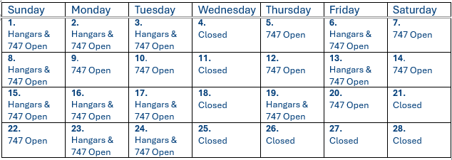 Museum Hours 9am-3pm, Hangars, 747 & Store are closed on Wednesday
