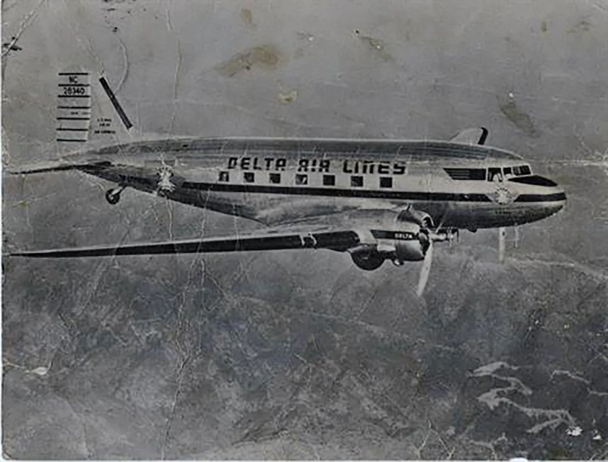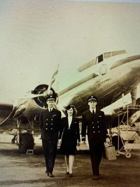 Former Delta Stewardess Dell Sutherlin with two pilots and a Delta DC-3 in the background
