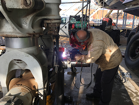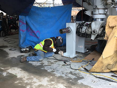 The concrete pads that Ship 6301 is resting on have steel plates embedded on the top. The final step of the jet stand installation was to weld the stands to those steel plates. In this image a welder works on one of the main landing gears: