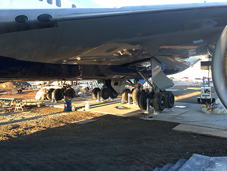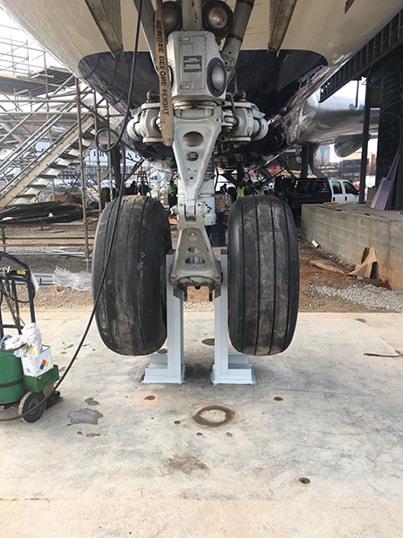 In order for our visitors to enter Ship 6301, the aircraft will be closely linked to towers and it was determined that limiting aircraft movement was essential for keeping Ship 6301 for decades. The stands not only raise the tires off the ground, they also act as tethers to keep the aircraft from lifting (even a 747-400 would be subject to lift if wind conditions were right) since they grab onto the gear axle. Additional tethers will be installed to keep Ship 6301's tail from moving the aircraft as well.