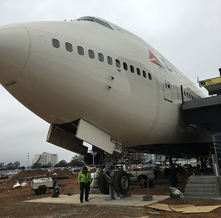 Progress on Delta Flight Museum's 747 Experience continues to move along and we are happy to announce that we passed a major milestone last week. Ship 6301 is once again in flight (a few inches) as the aircraft now sits securely on stands that take away any pressure on its eighteen tires.