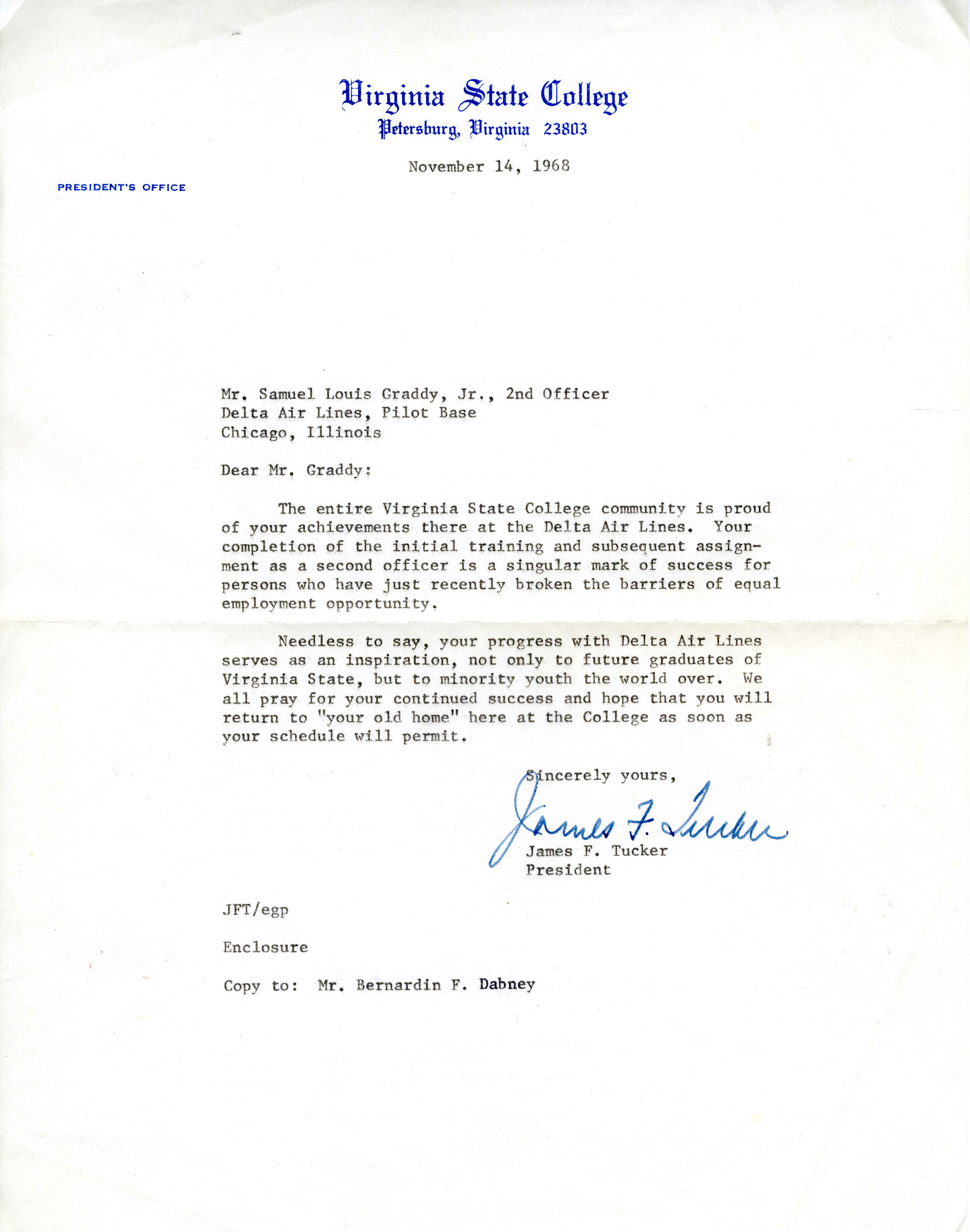 In 1968, when Delta Air Lines hired Sam Graddy, he became the first African American pilot for the airline. He received this congratulatory letter from his college Alma mater, which celebrated not only his personal accomplishment, but how his achievement served as an inspiration for "minority youth the world over"