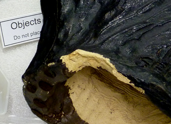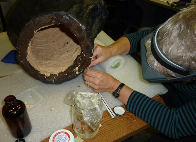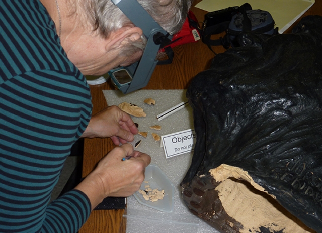 We sought the help of local objects conservator, Katherine Singley of Conservation Anthropologica. The goal of this treatment was to mend the damage and stabilize the sculpture for exhibition.