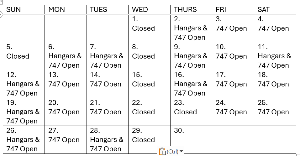 Museum Hours 9am-3pm, Hangars, 747 & Store are closed on Wednesday